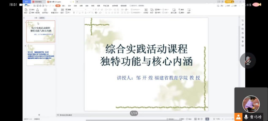邹开煌教授以教育部颁布新修订的义务教育课程方案和课程标准为切入点,强调该方案的改革重点中突出实践育人,以此引出本次讲座主题。讲座从综合实践活动课程的性质、独特功能、核心内容三部分展开讲述,提高了同学们对综合实践活动课程的认知,为同学们今后学习提供了方向。