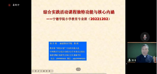 2022年12月2日晚,我院举办了主题为“综合实践活动课程的独特功能及核心内涵”的线上讲座。本次讲座由福建省教育学院教授、教育部“国培计划”首批专家邹开煌教授主讲。小学教育专业全体师生参加了本次讲座。