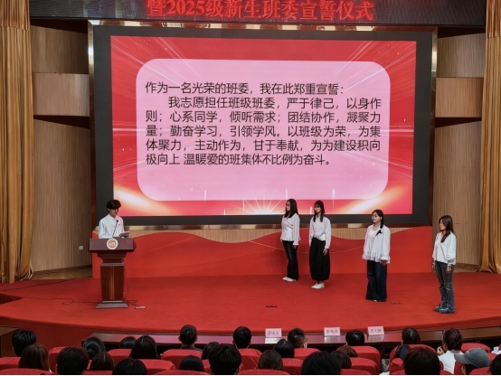 仪式在庄严的国歌声中拉开序幕。随后,新一届团委学生会成员与2025级新生班委在团旗下依次宣誓,誓言铿锵,彰显了服务同学、奉献校园的决心。接着,叶文煌同学带来歌曲《闪耀》,展现了学子朝气蓬勃的青春风采;学生代表随后发言,表达了共建优秀班集体的决心,引发了在场同学的共鸣。仪式还设置了向学生班导献花致谢,并由辅导员为他们颁发荣誉证书的环节。最后,蔡波尔副院长致辞,对新任学生干部提出殷切期望。