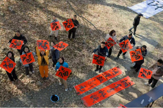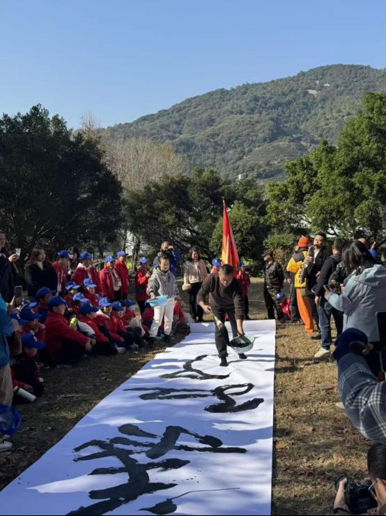 活动现场,陈必聪副教授挥毫泼墨,在十米宣绒长卷上,他以苍劲有力的笔触写下“枫叶红了”四字,笔墨间尽显枫景神韵与文化底蕴;随后,不同字体的“福”字在他笔下依次呈现,或端庄大气,或灵动洒脱,每一笔都饱含对乡村群众的美好新春祝愿。艺术教育系阮蕾晔、王红伟、孟明磊等教师到场助阵,与现场观众共同感受书法艺术与自然景致、音乐韵律交融的独特魅力。“书法+昆笛+萨克斯”的中西音乐对话,让陈必聪老师的笔墨丹青与丝竹雅韵、西洋旋律完美交融,为观众带来“视觉+听觉”的双重美学体验。